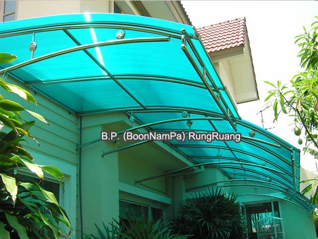 ถาพรีวิว งานติดตั้งหลังคาโพีคาร์บอเนต สีฟ้าเป็นแผ่นหลังคาโปร่งแสง โครงสอตนเลสไม่เป็นสนิม